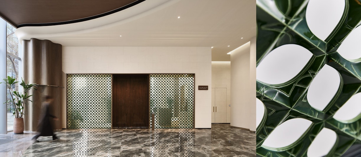 中国にあるVIP向けイノベーション施設のファサード。3Dプリンタの造形技術を応用し、デザインを生成。中国に古来から伝わる文様をモチーフに、タイルの1枚ずつの表面に15パターンの文様を描いた。内装建材への開発を目指している