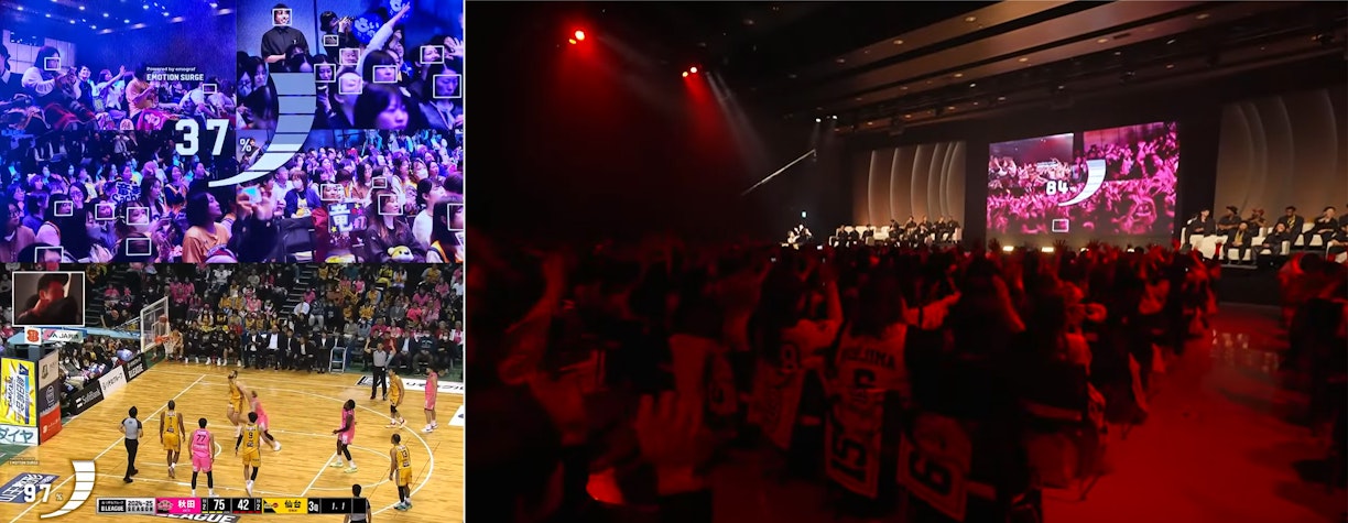 鈴木:私の場合、二つの方向で研究を進めています。一つは、空間の課題を「感情の可視化」から発見するアプローチ。もう一つは、感情データをリアルタイムに反映させて演出を変化させるアプローチです。たとえば、国内男子プロバスケットボールリーグ、B.LEAGUEのシーズンで活躍した選手を表彰する「B.LEAGUE AWARD SHOW 2024-25」では、観客の笑顔が増えると照明が赤く変わる仕掛けを実装しました。盛り上がりの度合いをリアルタイムで可視化し、翌年の演出改善にもつなげられるデータを取得しました。
