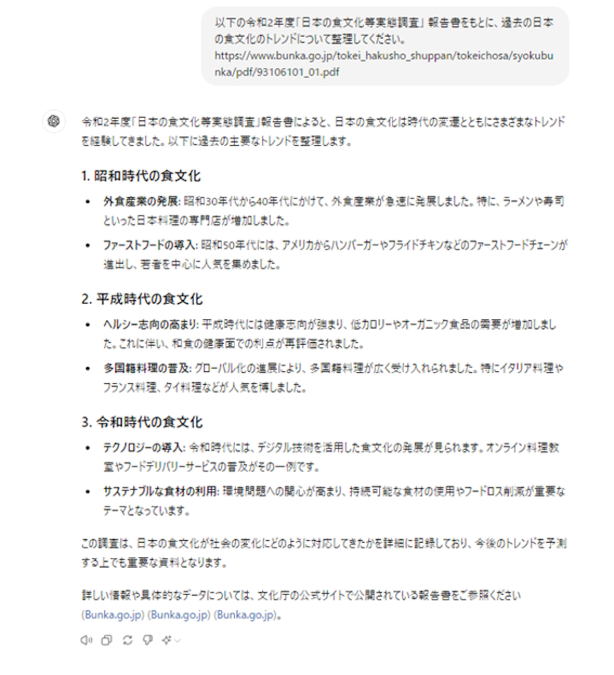 また、チャットにURLを記載すれば、そのウェブサイトの情報を要約することもできます。クライアントの企業や製品をサマリーしてほしいときに威力を発揮してくれます。データの考察と分析はとくに手間がかかる作業なので、時間を大幅に節約できます。