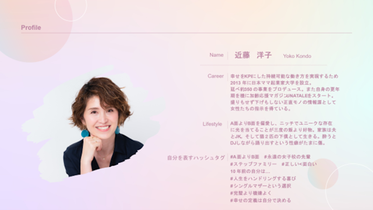 司会を務めるのは、近藤洋子さん。母親が「自分らしいキャリアや生き方」を模索し、好きを仕事にするための起業スクール「日本ママ起業家大学」の学長です。