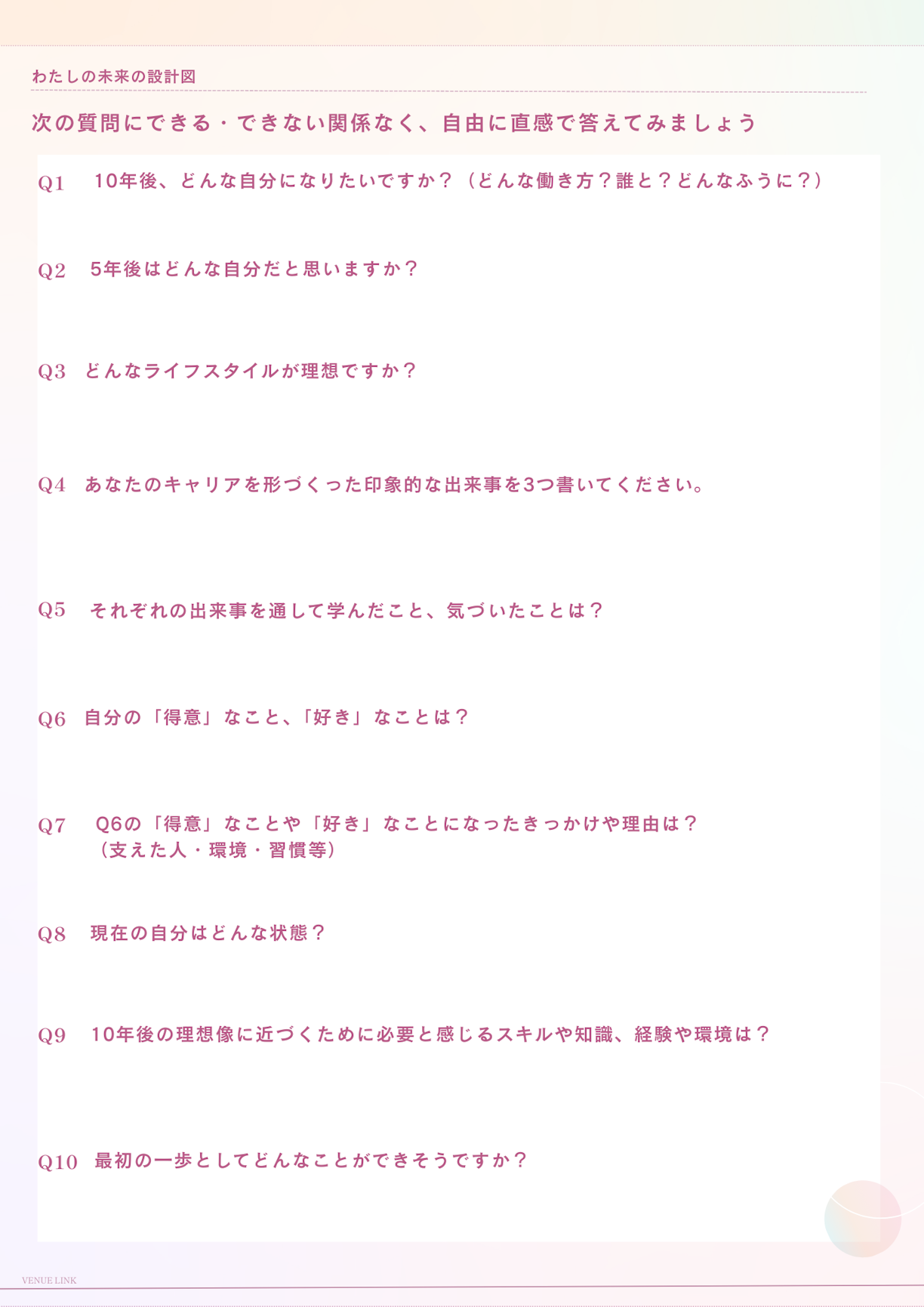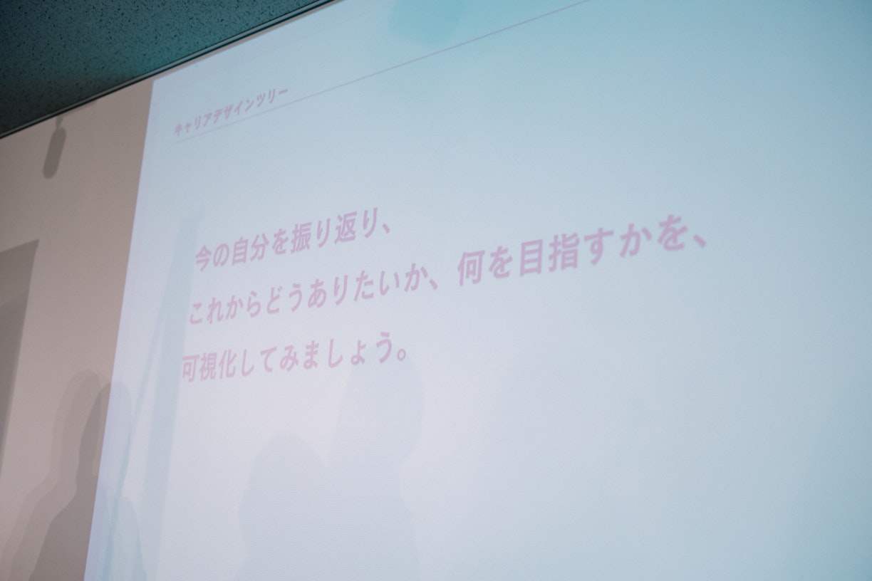 続いて、自分自身の内面とじっくり向き合うためのワークショップがスタートしました。VENUE LINK事務局の山本が、今回のメインワークである「キャリアデザインツリー」の描き方を説明します。