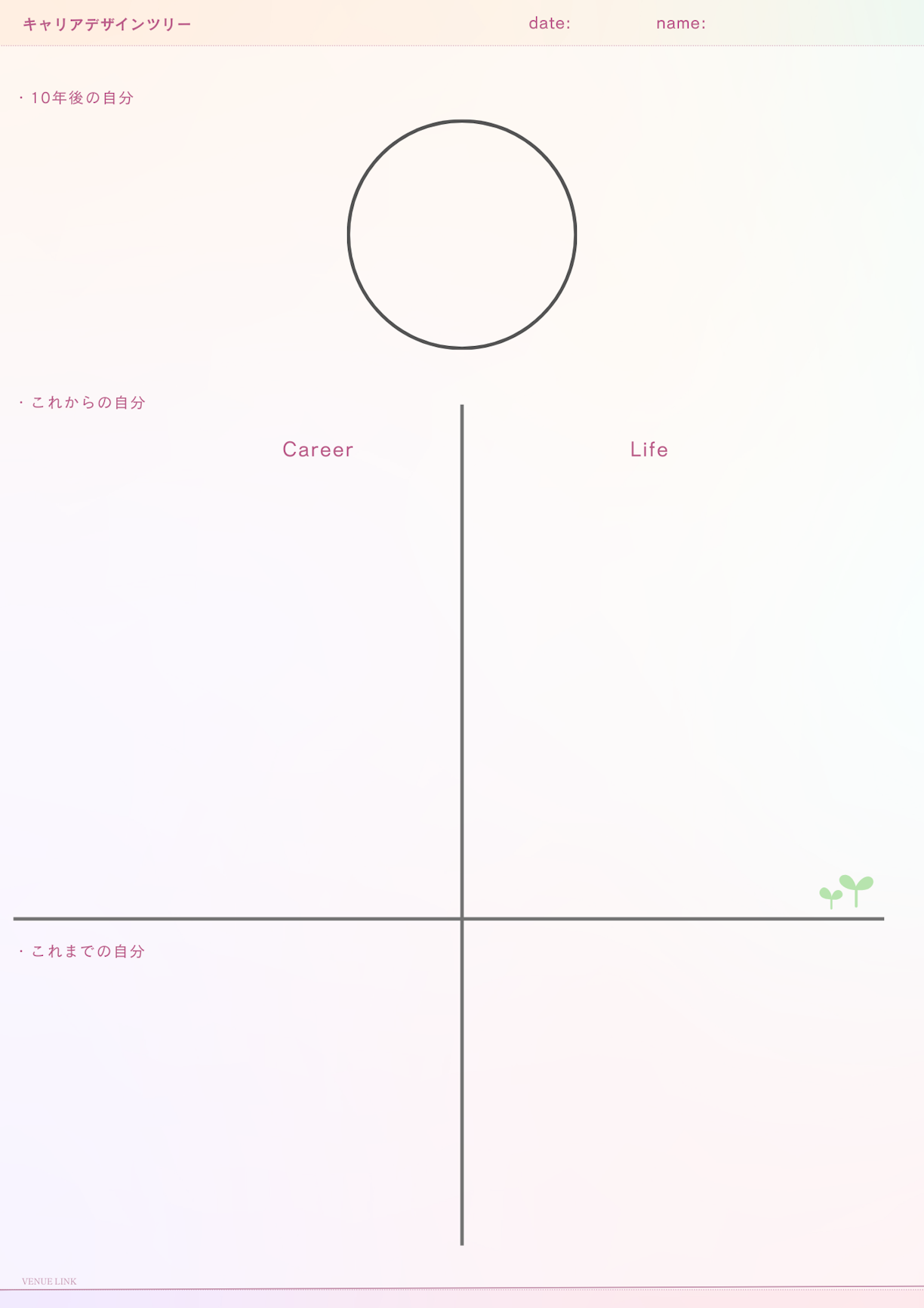 山本:今回は「キャリアデザインツリー」を皆さんと一緒に書いてみたいと思います。キャリアプランというと仕事の目標に特化しがちですが、このワークでは「ライフ」も含めた総合的な人生のデザインを目指します。 このツリーは、将来の理想の姿と、自分にとって大切なものを可視化することで、毎日をポジティブに進むための「道しるべ」となるものです。