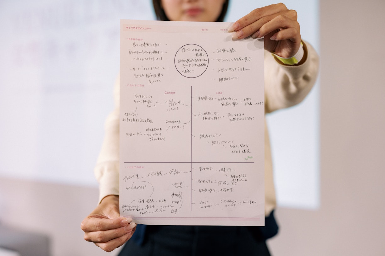 このワークの特徴は、幹の左側を「キャリア軸」、右側を「ライフ軸」と分けて描く点にあります。山本さんは「まずは太陽(10年後)から書き、次に根(過去)を振り返ることで、今の自分に足りないものや、これから挑戦したいことが見えてきます」と、具体的なステップを伝授しました。