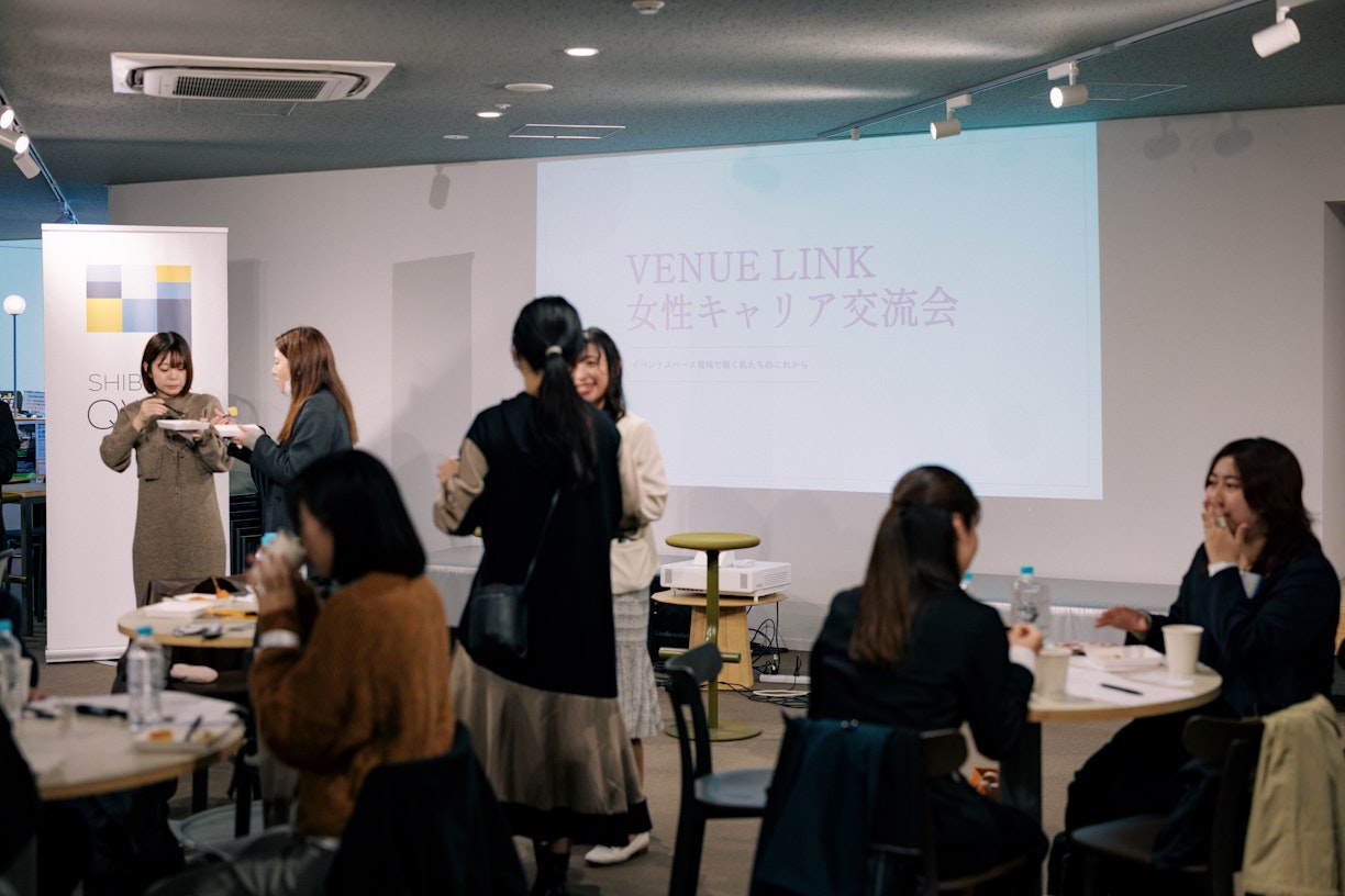 空間デザインやイベントプロデュース、マーケティングなど幅広い職種の26名が参加した「VENUE LINK 女性キャリア交流会」。始まりでは、この会を企画したVENUE LINK事務局から、開催に至った熱い主旨が語られました。