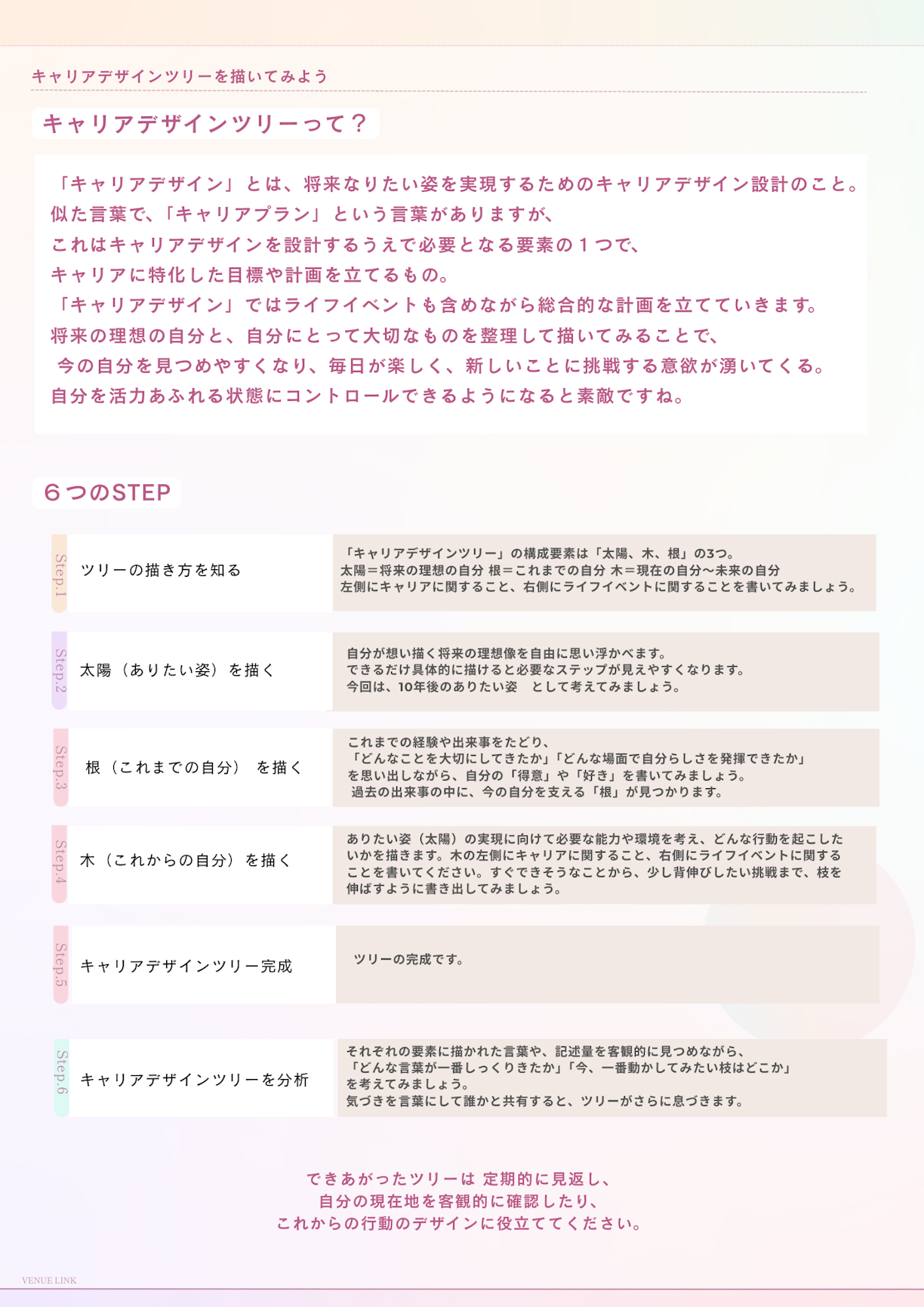 続いて、自分自身の内面とじっくり向き合うためのワークショップがスタートしました。VENUE LINK事務局の山本が、今回のメインワークである「キャリアデザインツリー」の描き方を説明します。