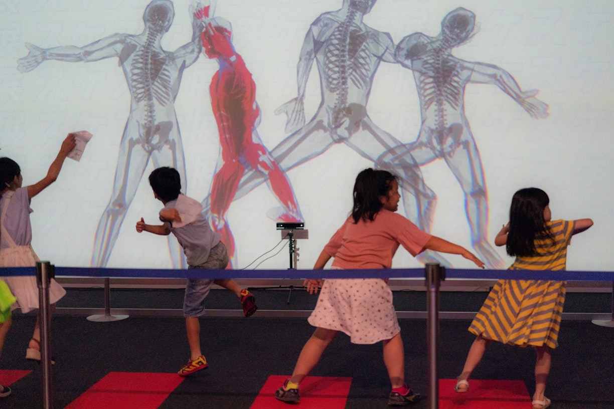 スクリーンの前に立つと体がスケて骨や血管、筋肉が映し出される「にんげんスケスケ」、いろいろな骨から動物を推測する「どうぶつスケスケ」、透明なピアノや構造が見える車など身近なのに知らなかった製品の内側を知る「くらしスケスケ」などを展示。