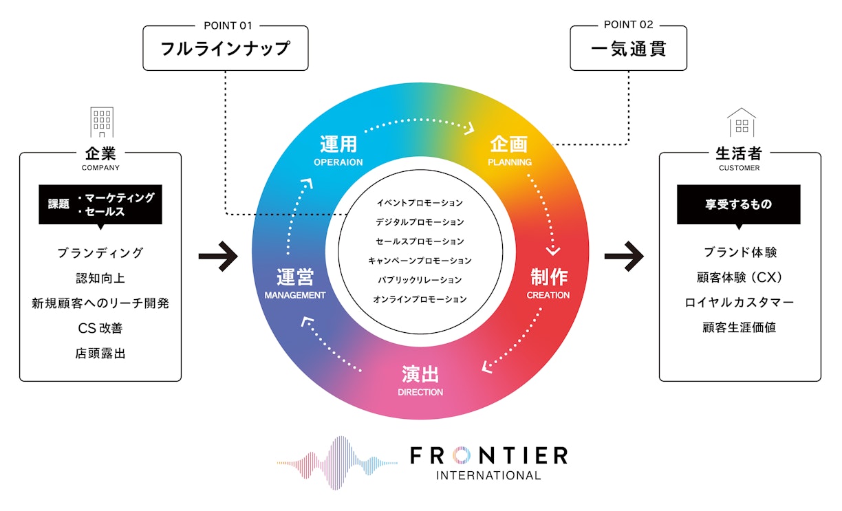 取締役 営業統括本部 江口貴宣氏(以下、江口):フロンティアインターナショナルの前身は、大学生向けのリアルイベントを企画・運営する学生団体でした。その人的ネットワークをもとに構築した学生や若手人材の動員力は、学生をターゲットにする企業から注目され、需要が増加。この経験を活かし、生活者全般と企業を密接に結びつけるプロモーション事業を展開するため、1990年に株式会社フロンティアインターナショナルを創業しました。