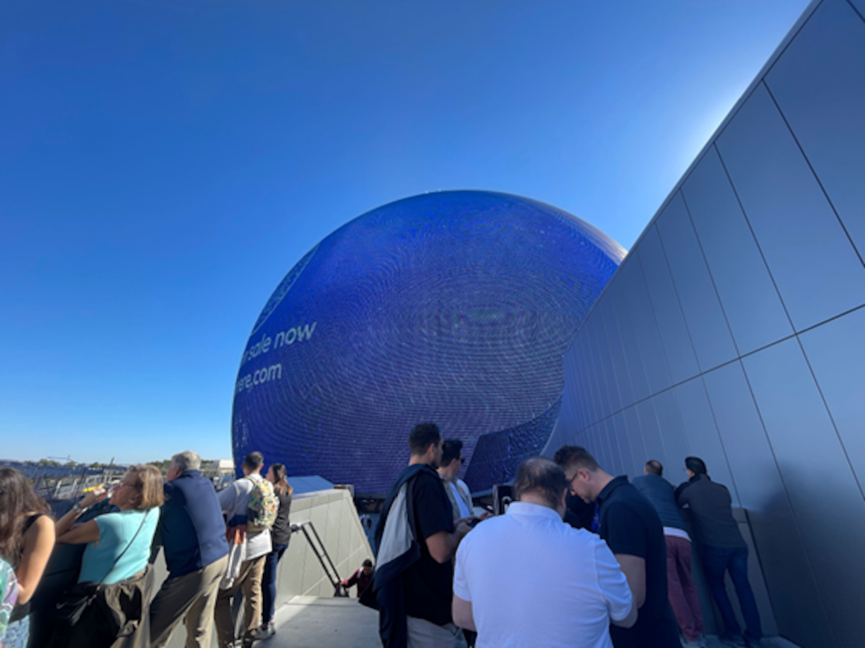その中でも、強く記憶に残ったのが2023年9月にラスベガスで開業した「Sphere(スフィア)」です。建物全体がLEDで覆われ、360度の音響を備えた巨大な球体アリーナで、外壁と内部の超高精細LEDが音や演出に合わせて変化し、体験者はデバイスの装着なく深い没入体験を得ることができます。