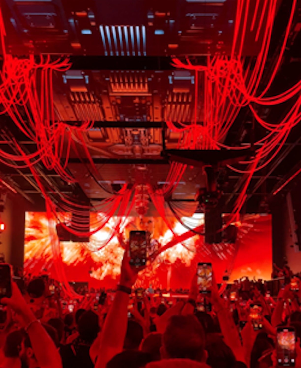 もう一つ、スペイン・イビサ島にあるクラブで目にした光景についても触れておこうと思います。ステージのディスプレイからそのままLEDが天井方向に伸びていて、映像の動きが立体的な光として空間に流れ出していく演出です。映像と光が分離せず、空間の中でつながり合いながら動くことで、演出全体が一段と立体的になっていました。